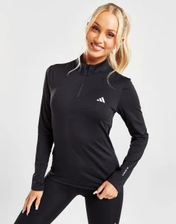 Prep for the workout in this women’s Techfit Training 1/4 Zip Top from adidas. Comin’ in a black colourway, this top is made with ultra-smooth recycled poly with added stretch for essential comfort. It has a Techfit design for a sleek, streamlined silhouette, and features a 1/4 zip closure with a raised collar to adjust your look and your airflow. It’s crafted with sweat-wicking AEROREADY tech with mesh details for added breathability, and is finished up with adidas’ iconic Badge of Sport logo at the chest. Machine washable. | Our model is 5’5″ and wears a size small.