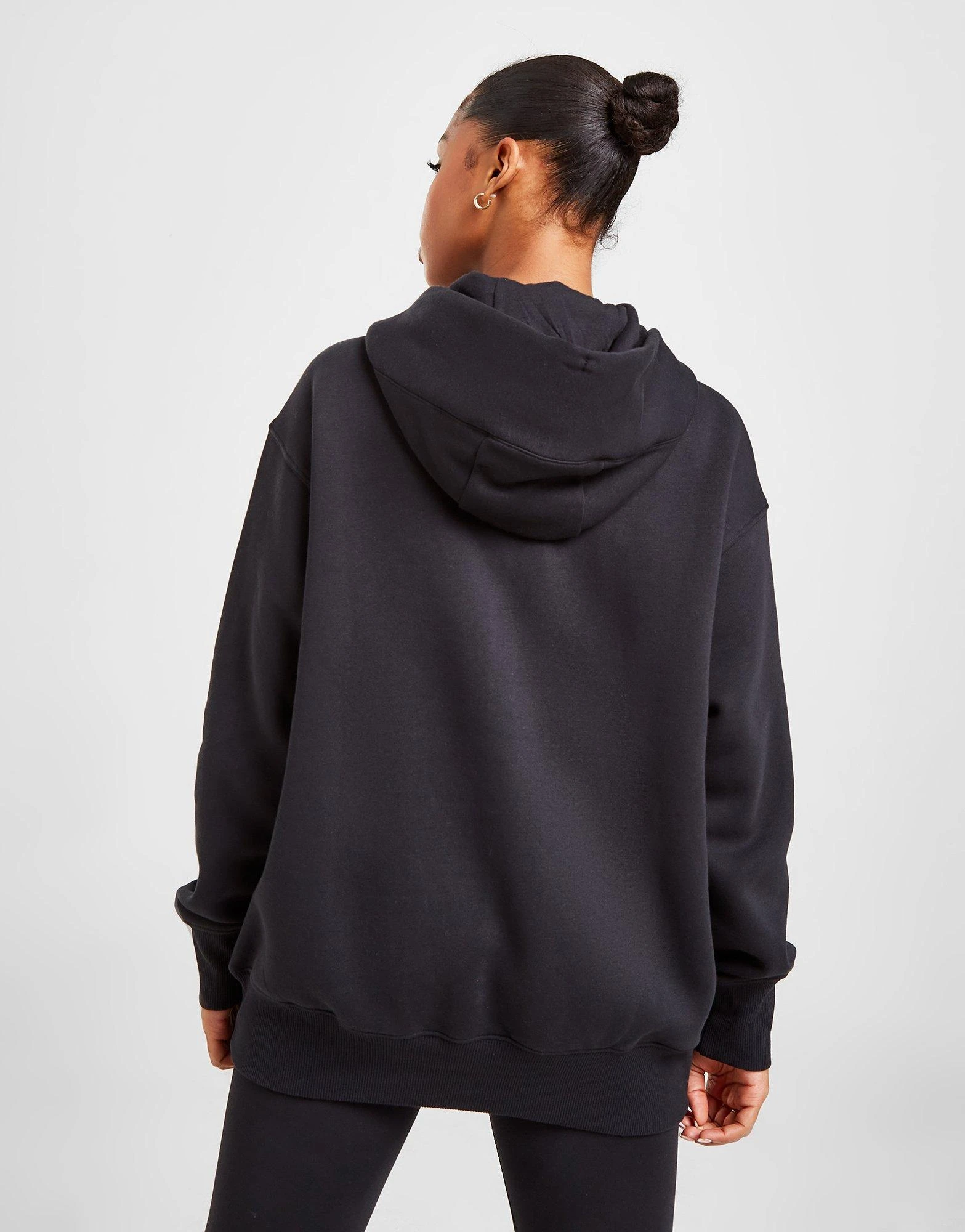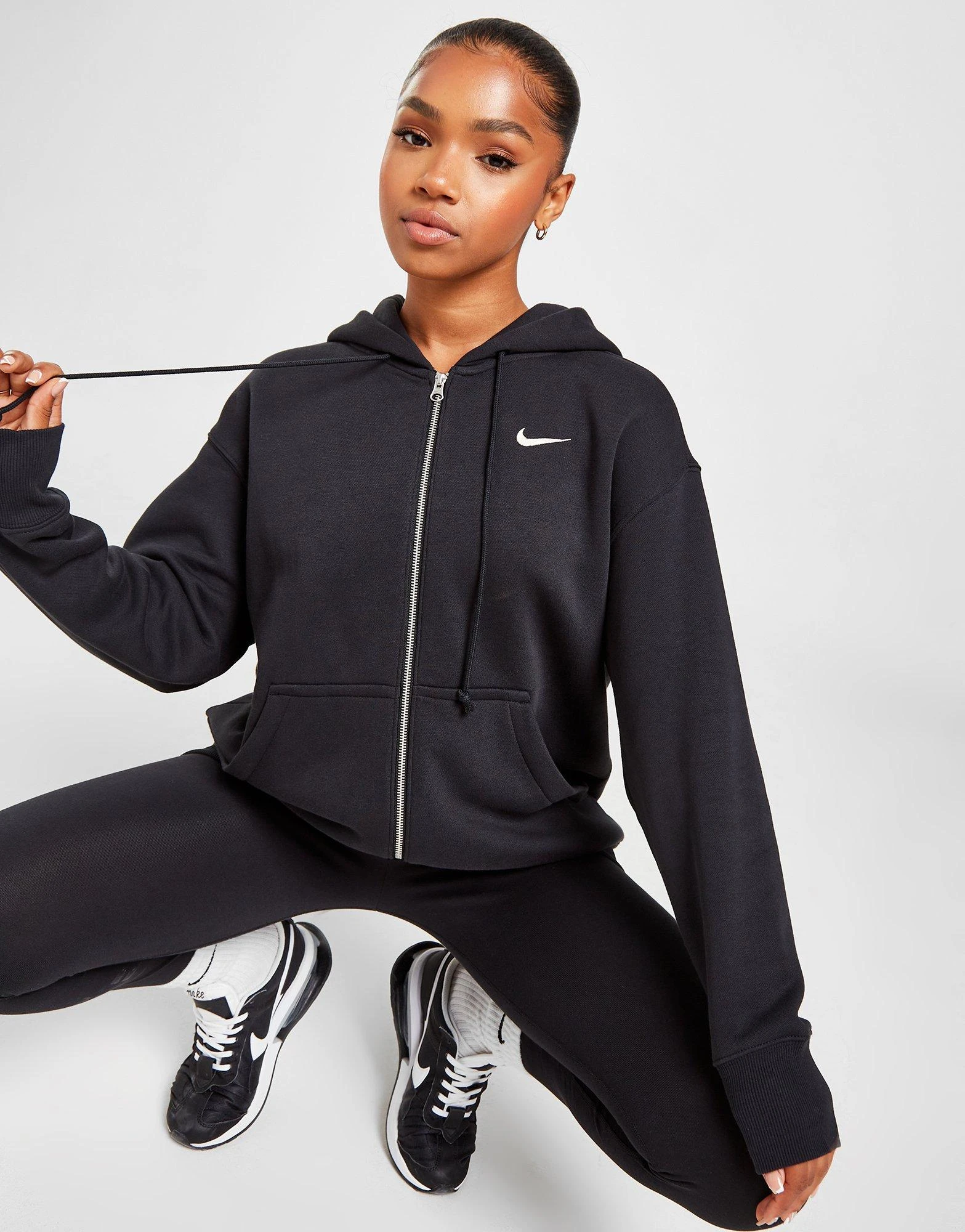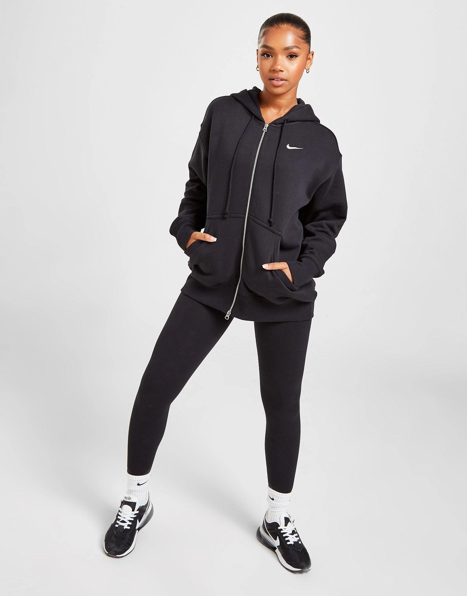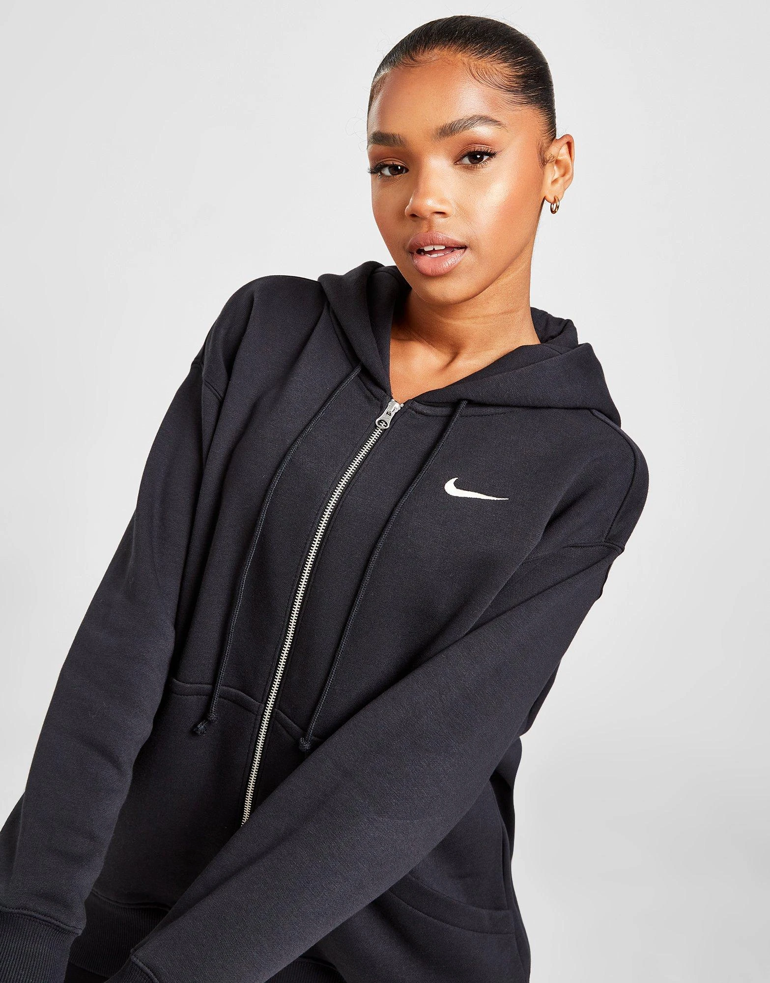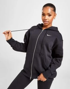 Cosy up on chill days with this women’s Phoenix Fleece Oversized Full Zip Hoodie from Nike. Comin’ in a Black colourway, this laidback layer is made with super-soft brushed fleece for essential omfort. It fits oversized for a chilled vibe, and features a full zip fastening and an adjustable four-panel hood for custom coverage. It has long, roomy sleeves with dropped shoulders, and longer-length ribbed trims to secure the fit. With a split kangaroo pocket up front, it’s finished up with signature Nike branding at the chest. Machine washable. | Our model is 5’7″ and wears a size small.