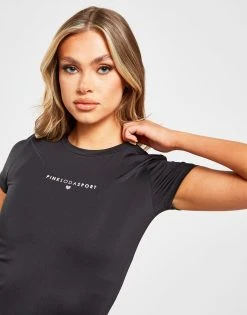 Go through the gears when you pull on this women’s Essentials Short Sleeve Top from Pink Soda Sport. In a classic black colourway, this slim-build tee features a crew neckline and short sleeves for unrestricted comfort. Made from smooth and stretchy recycled poly fabric, with sweat-wicking tech for cool comfort, this workout top is finished off with signature Pink Soda Sport branding to the chest. Machine washable. | Our model is 5’7″ and wears a size 8.