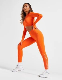 Freshen up yur fitness essentials with these women’s Topanga Tights from Pink Soda Sports. In a Dusty Orange colourway, these tights are cut from smooth, stretchy recycled poly fabric for lasting comfort. With an ultra-lightweight feel and a tight fit, they feature an elasticated, high-rise waistband with a woven finish and wrap-around detailing. Finished up with a contrast Pink Soda Sport wormark at the lower leg, and tonal branding around the waist. Machine washable. | Our model is 5’8″ and wears a size 8.
