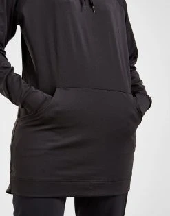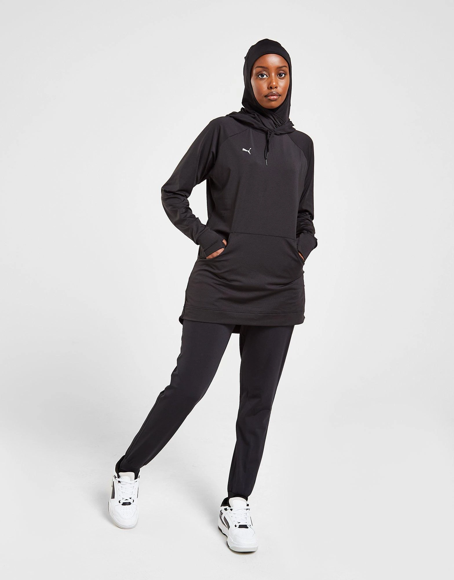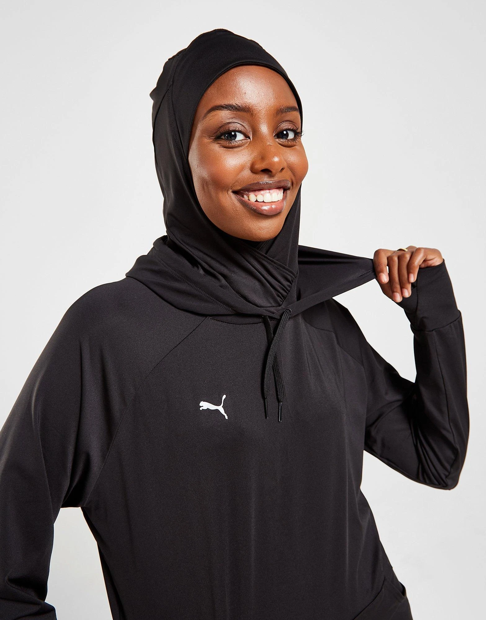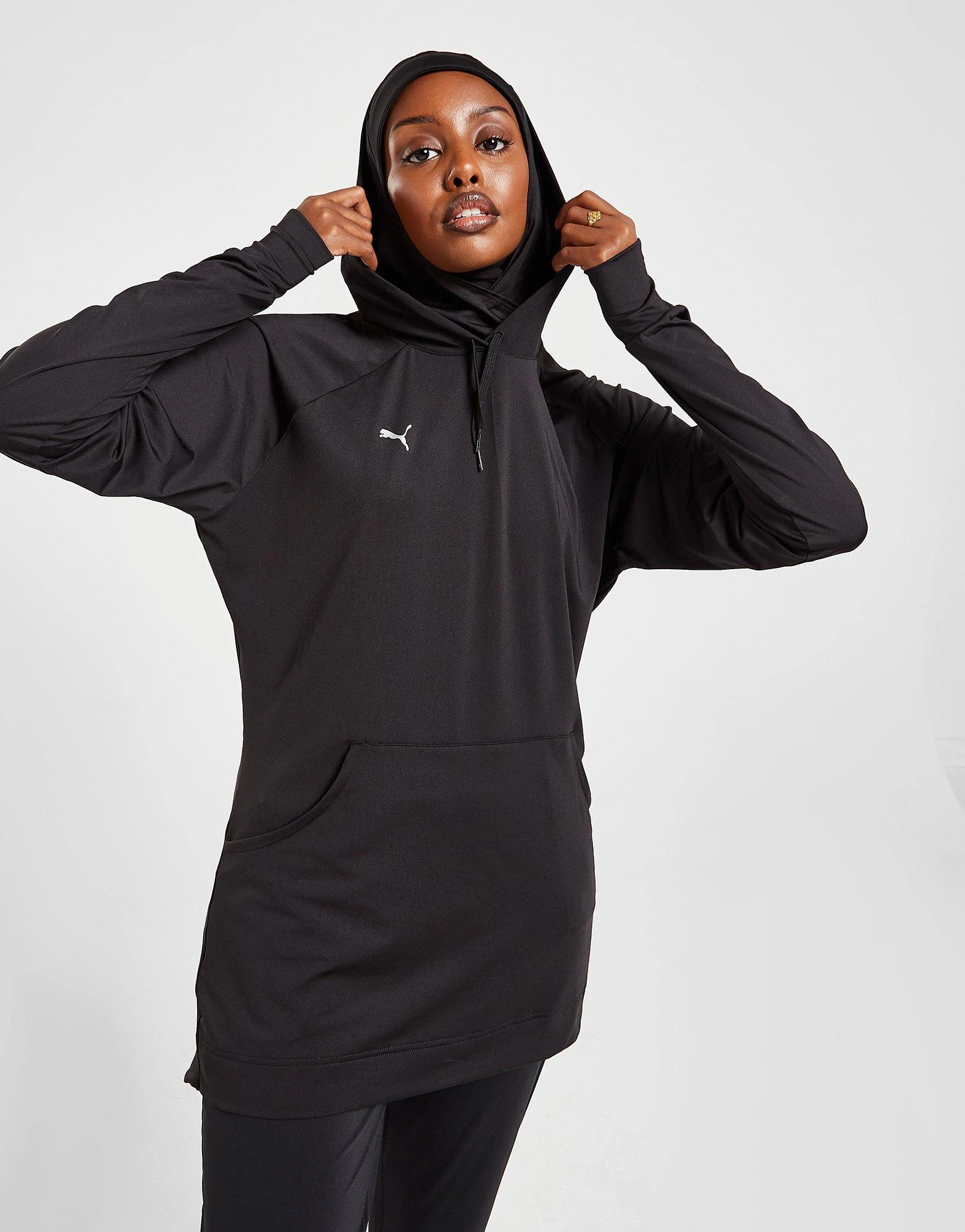 Grab extra coverage when you train with this women’s Modest Hoodjab from PUMA. In a PUMA Black colourway, this relaxed-fit pullover is made from stretchy poly fabric, with signature dryCELL tech to wick sweat from the skin. It has long raglan sleeves, an extended hem and a raised neckline with a drawcord-adjustable hood for essential protection. With ribbed cuffs and a kangaroo pocket for your must-have items, this hoodie is finished off with signature PUMA Cat branding to the chest. Machine washable. | Our model is 5’6″ and wears a size small.