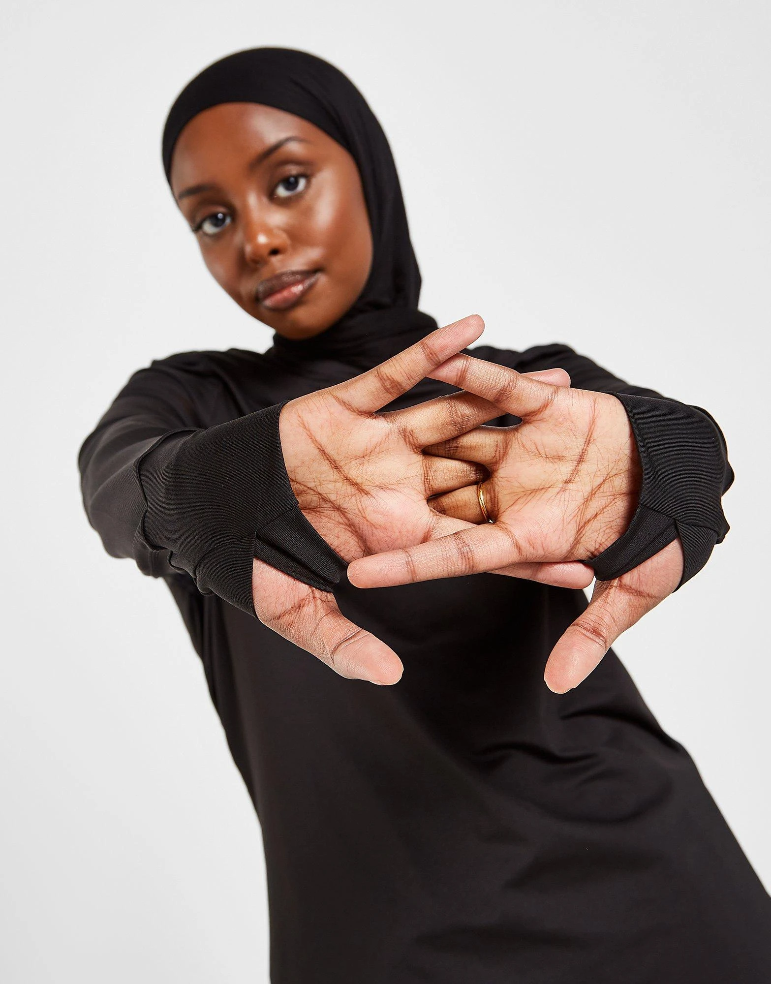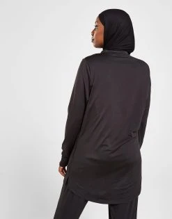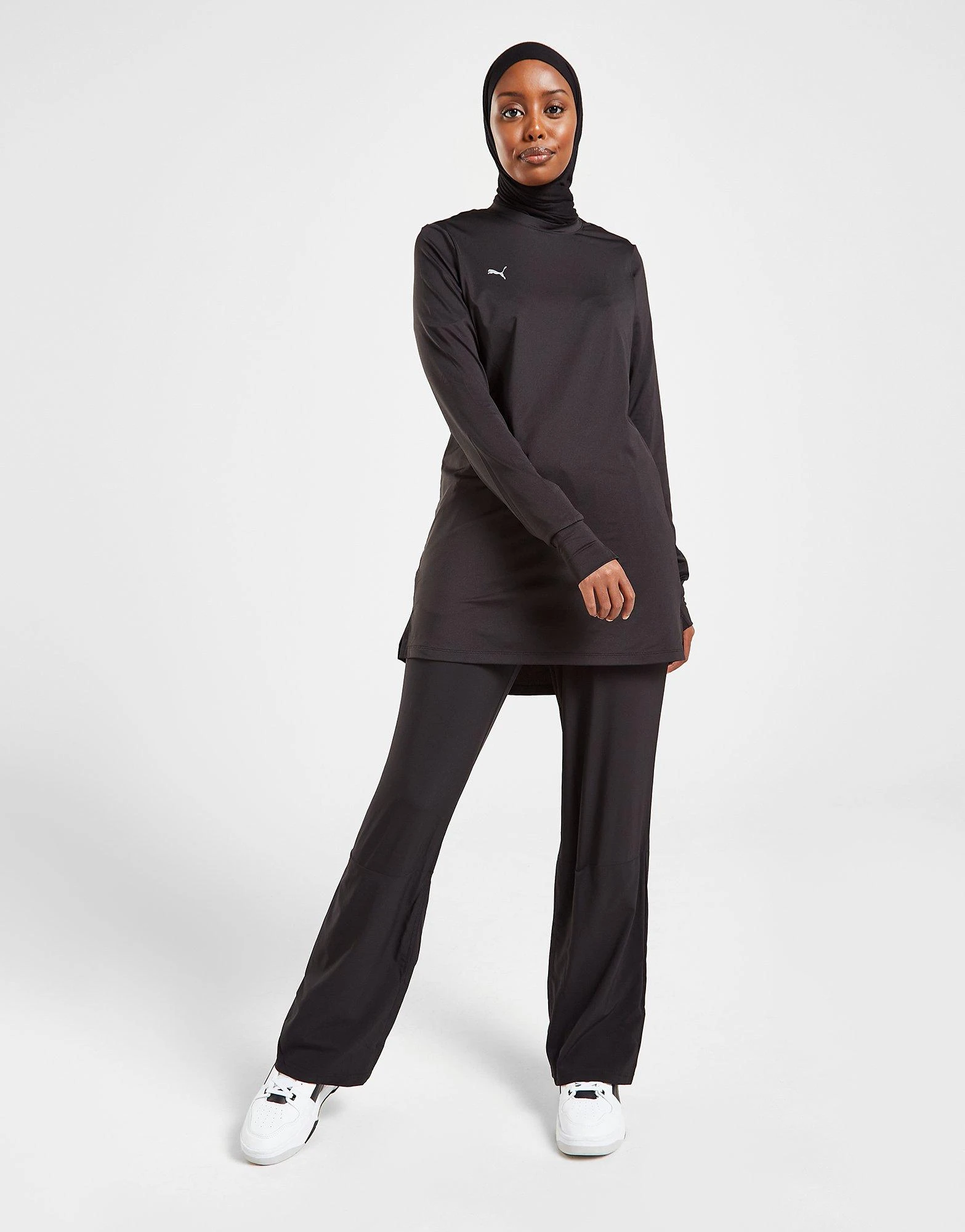 Level up your training with this women’s Modest Long Sleeve Top from PUMA. Built for extra coverage, this workout top has a semi-mock neckline and long sleeves with stretchy thumholes at the cuffs to hold them in place. It’s made from at least 20% recycled materials, built from smooth poly fabric, with sweat-wicking dryCELL tech to keep you cool. Landing in a PUMA Black colourway, this top is finished off with signature PUMA Cat branding printed to the chest. Machine washable. | Our model is 5’6″ and wears a size small.